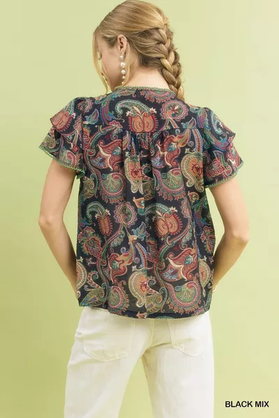 Umgee Mix Paisley Ruffle Sleeve Top