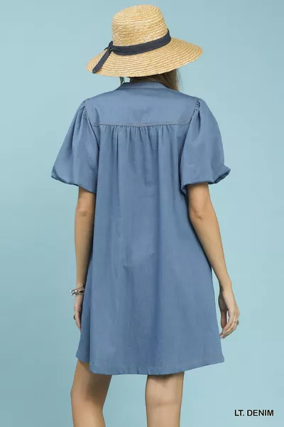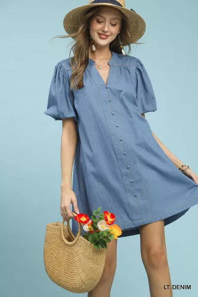 The Chambray Puff Sleeve Dress is a charming and stylish choice for any occasion. Its chambray fabric gives it a casual yet polished look. The puff sleeves add a touch of femininity and on-trend detail. This dress can be easily dressed up with heels or dressed down with sneakers for a versatile outfit. Perfect for a day out or a casual dinner, this dress is a versatile addition to any wardrobe.