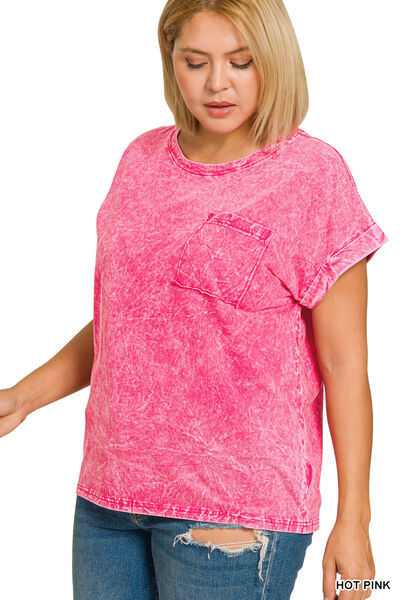 Zenana Full Size Crinkle Washed Round Neck Folded Short Sleeve Tee Plus Size