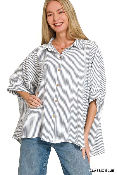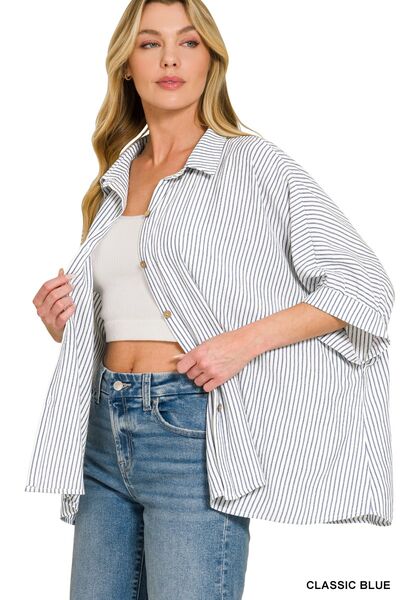 Zenana Woven Stripe Button Down Boxy Shirt