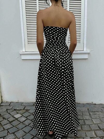 Polka Dot Ruched Strapless Maxi Dress