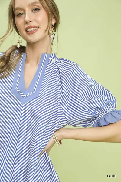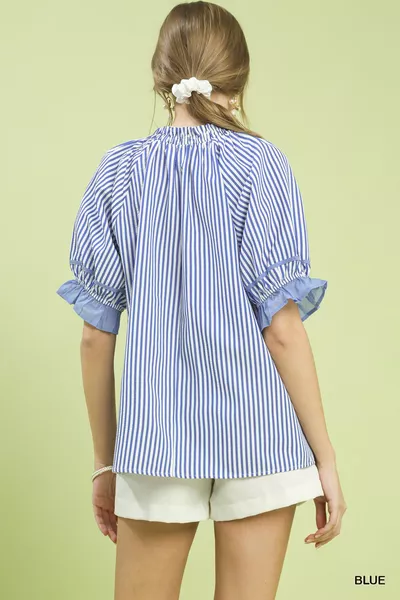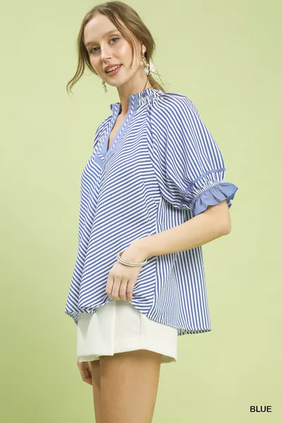 Umgee Stripe Ruffle Sleeve Split-Neck Blouse