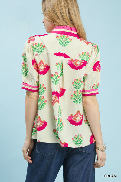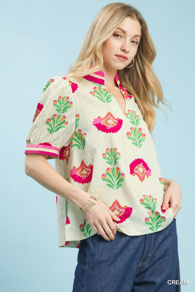 Umgee Print Puff Sleeve Blouse with Contrast Trim