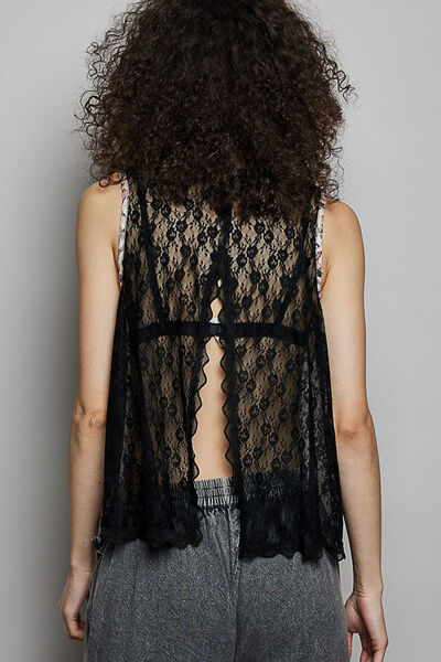 The round-neck sleeveless relaxed-fit top is crafted from printed woven fabric, showcasing a stylish and versatile design. It features delicate lace trim that adds a touch of elegance to the piece. The open lace back panel with button closure enhances its feminine charm. Lightweight and airy, this top is an ideal choice for summer styling and casual wear. Its effortless layering capability makes it a wardrobe essential for creating chic and relaxed outfits.
