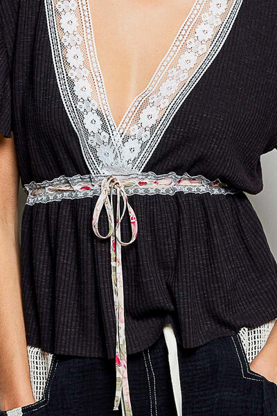 POL Tied Ruffled V-Neck Short Sleeve Blouse with Lace Detail