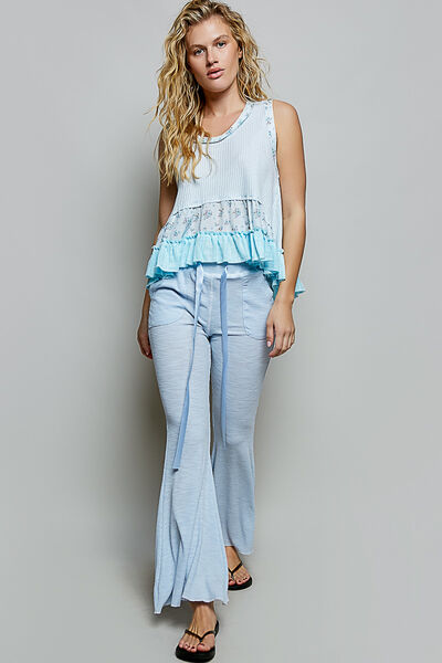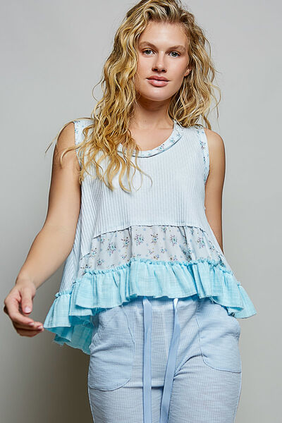 POL Floral Print Patche Round Neck Ribbed Tank with Double Gauze Ruffle Accents