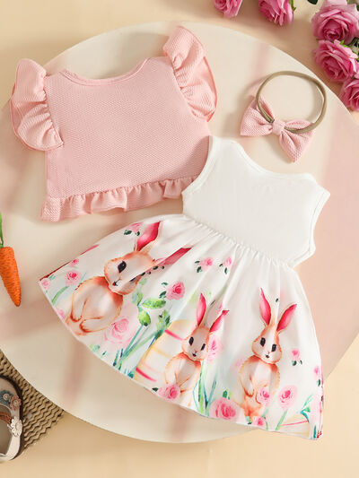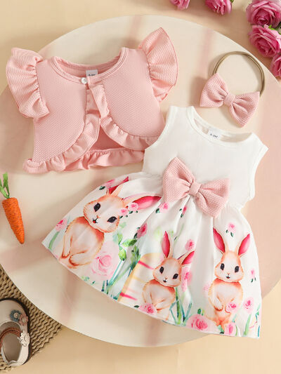 Children's Bunny Print Dress with Ruffle Cardigan & Headband Set
