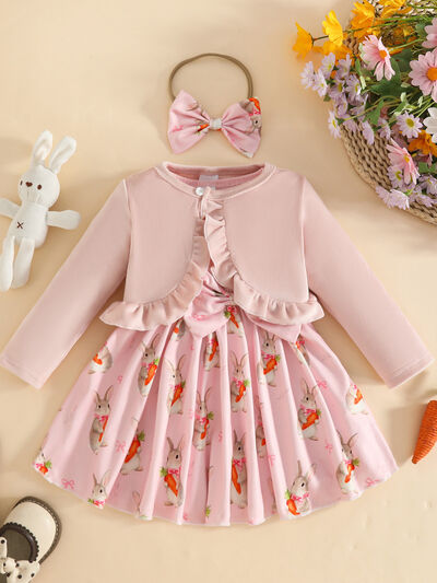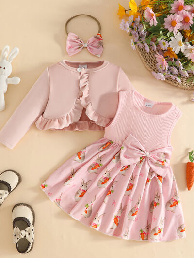 Children's Ruffled Cardigan and Bow Dress Set with Headband