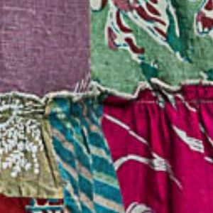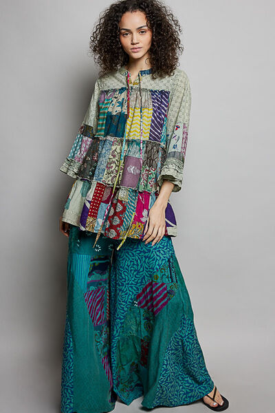 A V-neck dress top designed with 3/4-length sleeves and a relaxed, roomy fit. Crafted from printed woven fabric, it offers a lightweight and comfortable feel. The varied patchwork construction adds visual interest and a unique, artisanal touch. Shirred ruffle accents and delicate drawstring details enhance the soft, feminine silhouette. This piece blends gentle structure with expressive texture for an effortlessly stylish look.