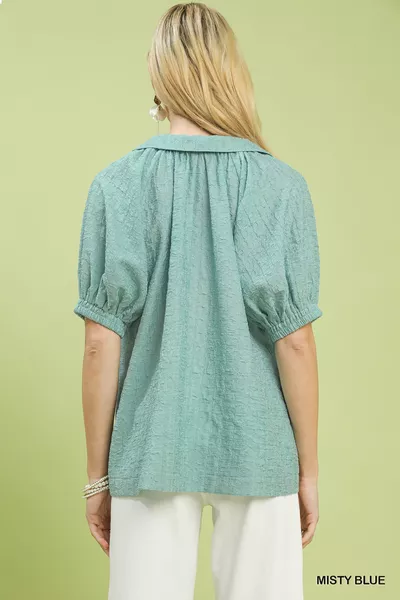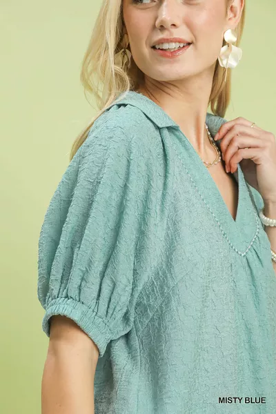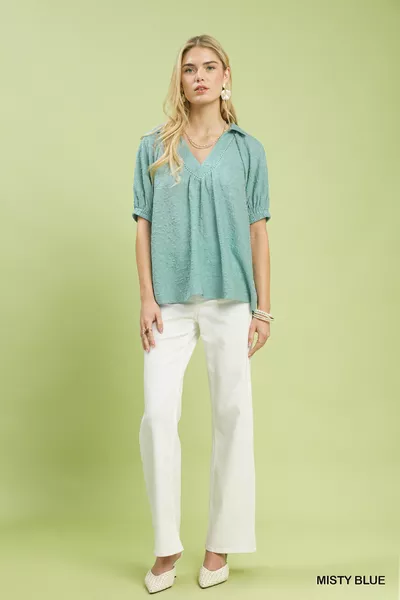 This textured short sleeve top is both stylish and comfortable. It features short sleeves with elastic cuffs for a relaxed fit, paired with delicate trim details that elevate its design. The top is unlined, making it lightweight and perfect for everyday wear.