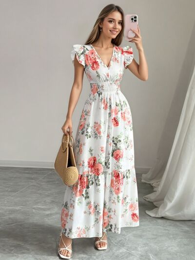 Floral Print Ruffle Sleeve Tiered Maxi Dress