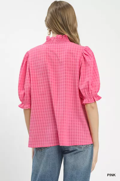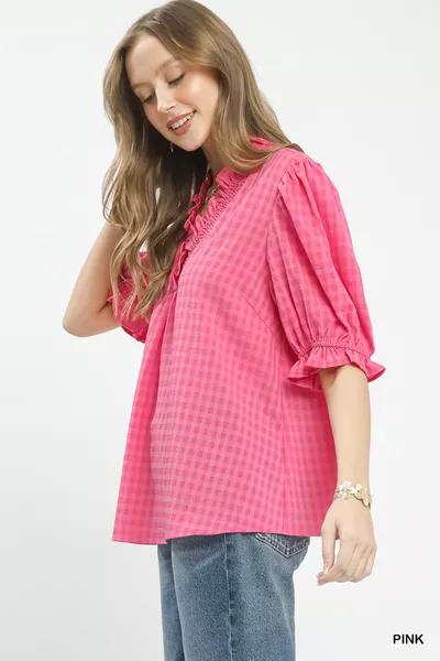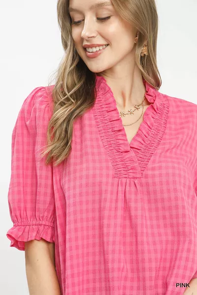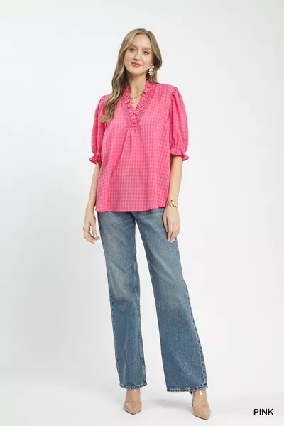 This Textured Check Ruffle V-Neck Blouse features a subtle textured check pattern, delicate ruffle details, and a flattering V-neck. It offers a lightweight, flowy fit that blends feminine charm with modern style for daily and casual occasions.