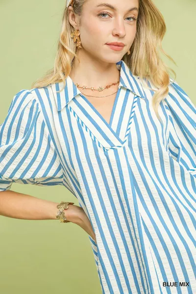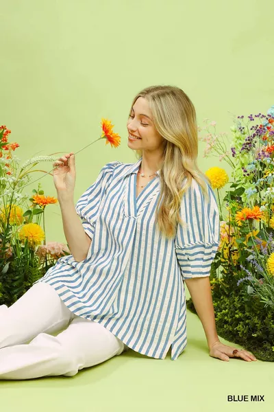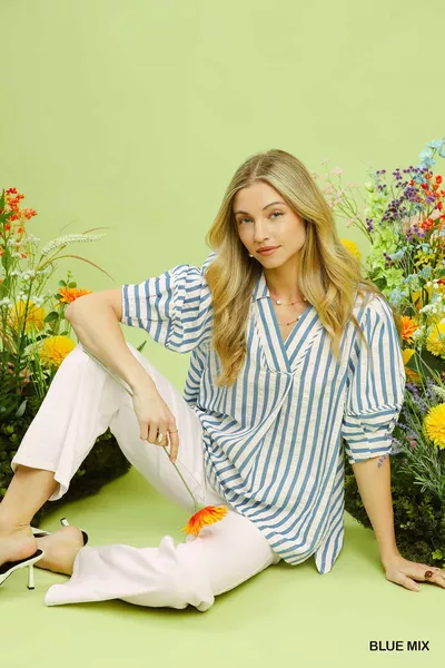This striped puff sleeve blouse features elegant vertical stripes, a flattering V-neck with wide collar detail, feminine puff short sleeves, and delicate piping details, while its unlined design ensures lightweight, breathable comfort for a chic and effortless everyday style.