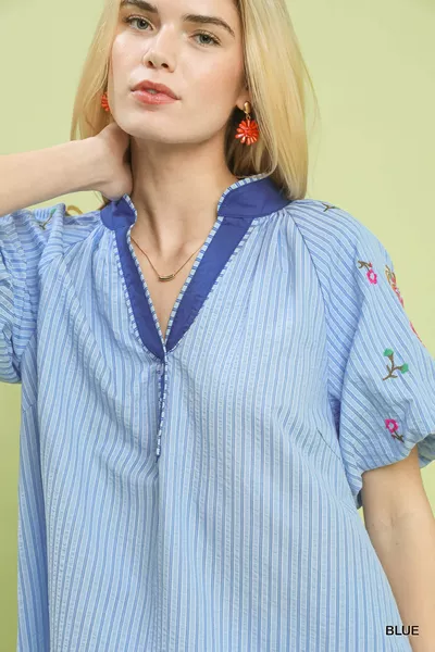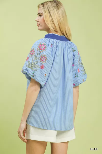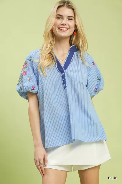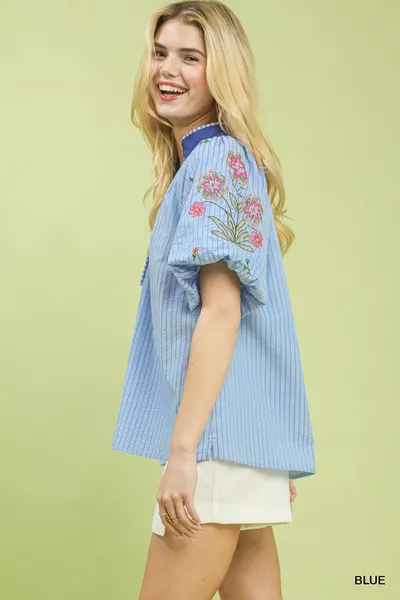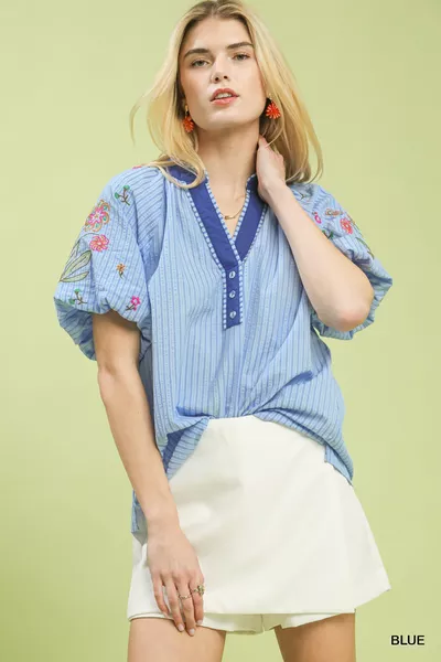 This stylish blouse features a classic striped pattern with delicate floral embroidery on the puff sleeves, adding a touch of femininity. The V-neckline with button detailing enhances the overall design. Made from a lightweight and breathable fabric, this blouse ensures comfort and is perfect for warm weather. Its versatile style makes it suitable for both casual and semi-formal occasions. The blouse is easy to care for and available in multiple sizes to ensure a perfect fit. The material is a soft, breathable cotton blend, providing all-day comfort. The puff sleeves add a fashion and fashionable touch, making it a must-have addition to any wardrobe.