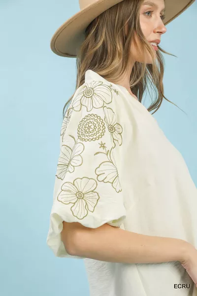 This stylish blouse features delicate floral embroidery on the puff sleeves, adding a touch of elegance and femininity. Made from a lightweight and breathable fabric, this top is perfect for warm weather. The versatile style can be dressed up or down, making it suitable for both casual and dressy occasions. Pair it with jeans or shorts for a casual look, or dress it up with a skirt and heels for a more formal event. The blouse is easy to care for and available in multiple sizes. The unique design and attention to detail make this blouse a must-have addition to any wardrobe.