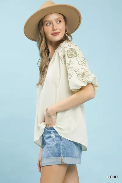 Umgee Embroidered Sleeve V-Neck Boho Blouse