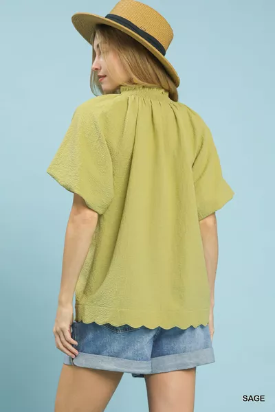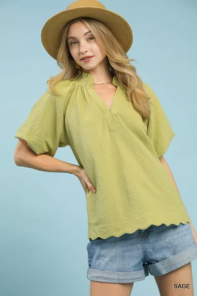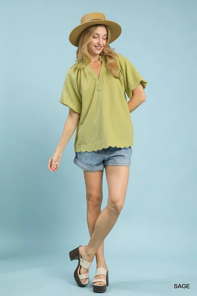 This Scalloped Hem Textured Blouse features a delicate scalloped hem and unique textured fabric. Designed with a flattering fit and lightweight feel, it adds an elegant, feminine touch to your daily casual outfits.