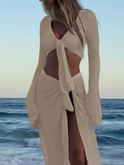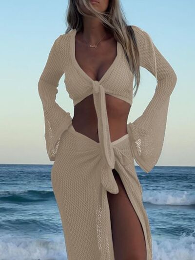 Crochet Knit Long Sleeve Crop Top and Slit Skirt Sweater Set
