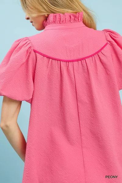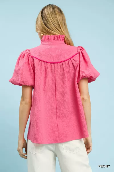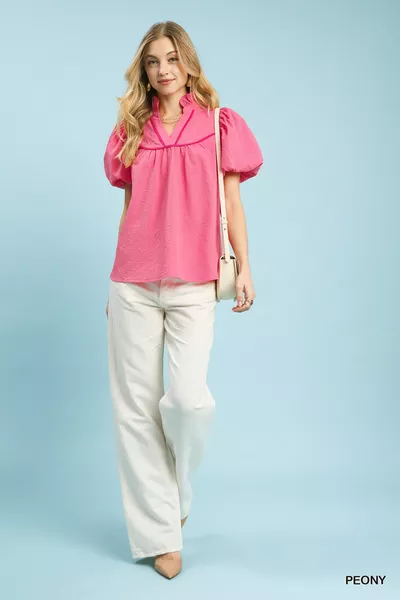 This stylish blouse features a unique textured fabric that adds visual interest. The puff sleeves create a fashionable and feminine silhouette. The V-neckline is accented with a contrasting trim, enhancing the overall design. Made from a lightweight material, this top is comfortable to wear and perfect for warm weather. Its relaxed fit makes it easy to style with various bottoms, from jeans to skirts. The vibrant color adds a pop of personality to any outfit. Ideal for casual outings or dressed-up occasions, this blouse is a versatile addition to any wardrobe. Material: Likely a blend of cotton and polyester for comfort and durability. Selling points: Fashion-forward design, comfortable fit, and versatile styling options.