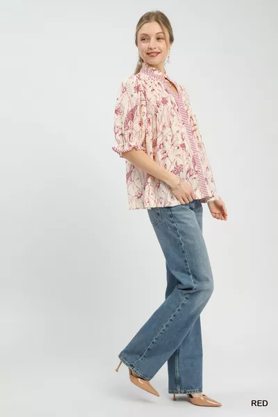 This Mixed Print Button Front Top features a button-front design, smocked yoke, and puff sleeves. It is unlined for a lightweight, effortless fit perfect for casual everyday styling.