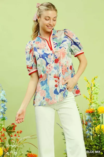 This floral print blouse is a must-have for your wardrobe. Featuring a vibrant all-over floral print, puff sleeves, and a mandarin collar with a V-neckline, this top is both stylish and comfortable. The red contrast trim adds a pop of color and elevates the design. Made from a lightweight and breathable fabric, it's perfect for warm weather. Dress it up with a skirt and heels or keep it casual with jeans and sandals. This blouse is a versatile piece that can be worn for any occasion.