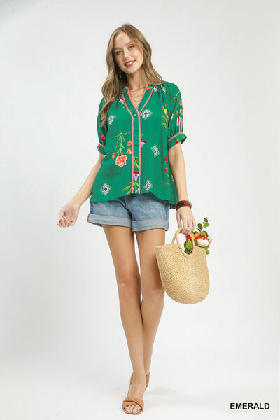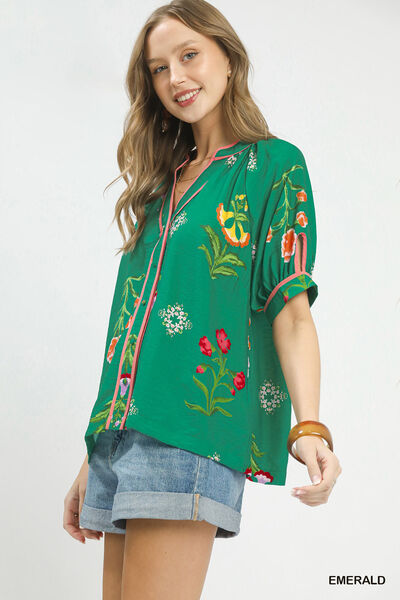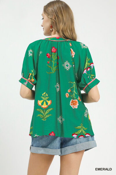 Umgee Botanical Print Contrast Trim Button Blouse