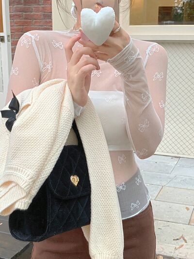 Bow Print Sheer Mesh Top