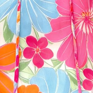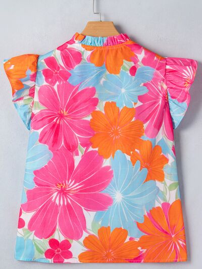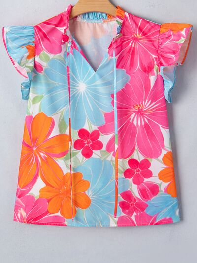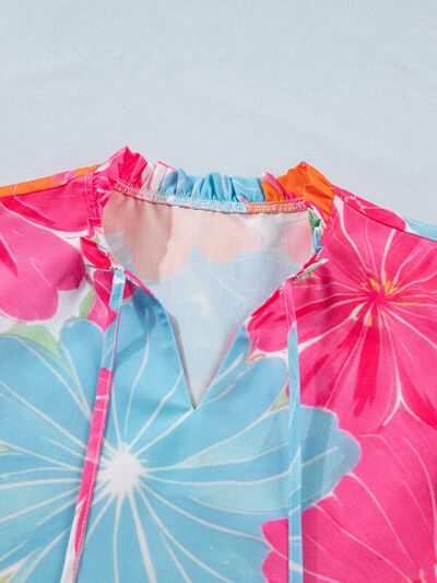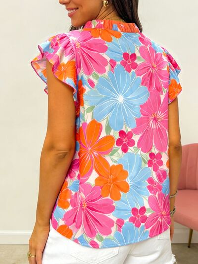 Flower Printed Tie V Neck Ruffle Trim Sleeveless Blouse