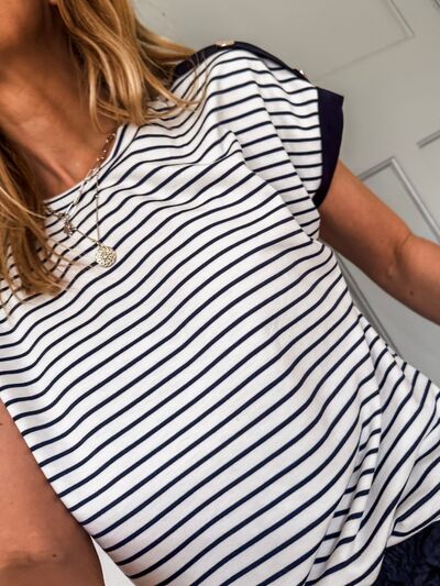 Stripe Cuffed Sleeve Button Decor Loose Tee
