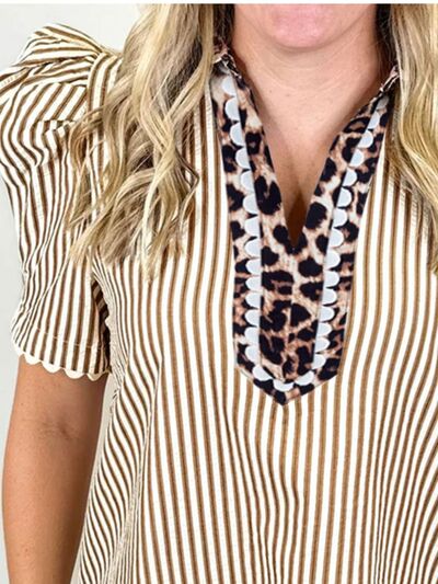 Stripe Ricrac Trim Short Puff Sleeve Leopard Patchwork Collar V Neck Blouse