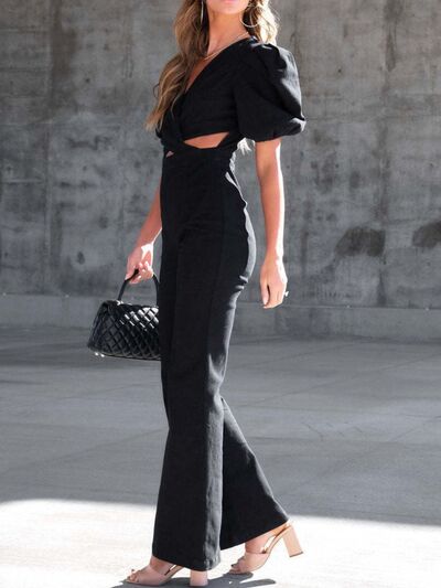 Cutout Puff Sleeve Denim Jumpsuit
