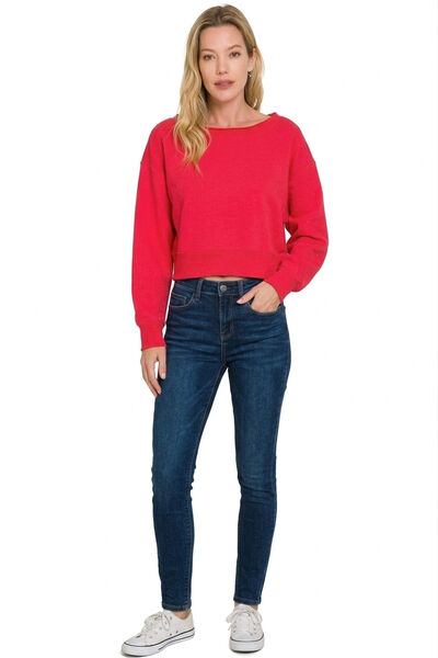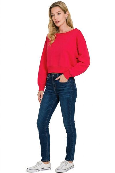 This stylish cropped sweatshirt is a must-have for your casual wardrobe. Crafted from a soft and comfortable blend of cotton and polyester, it features a flattering boat neckline, long sleeves, and a relaxed fit. The ribbed cuffs and hem add a touch of detail, while the cropped length makes it perfect for pairing with high-waisted jeans or skirts. Available in a vibrant ruby red color, this sweatshirt is sure to turn heads. Ideal for layering or wearing on its own, it's a versatile piece that you'll reach for again and again. The fabric is breathable and easy to care for, ensuring long-lasting wear.
