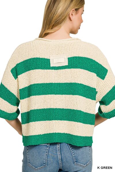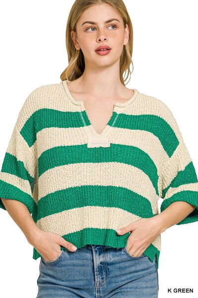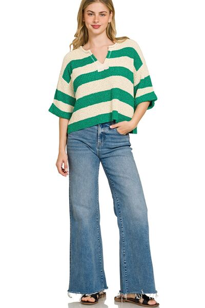 Zenana Split Neck Stripe Sweater
