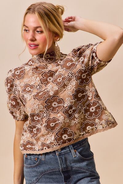 SO ME Texture Floral Mesh Top With Back Button Closure