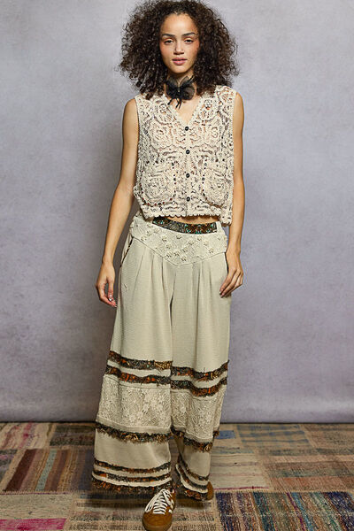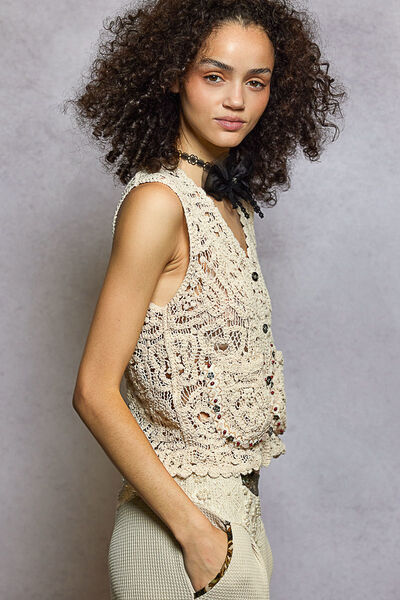 This V-neck sleeveless top features a relaxed fit crafted from crochet with beautiful varied patterns for a unique boho-inspired look. It is designed with dual patch pockets decorated with eye-catching studs and beads, adding a stylish decorative touch. The scalloped edge detailing enhances its delicate and feminine silhouette, elevating the overall design. A secure button closure ensures easy wearing and a neat finish. Made with breathable crochet fabric, it combines comfort and intricate detailing perfectly for casual everyday styling.