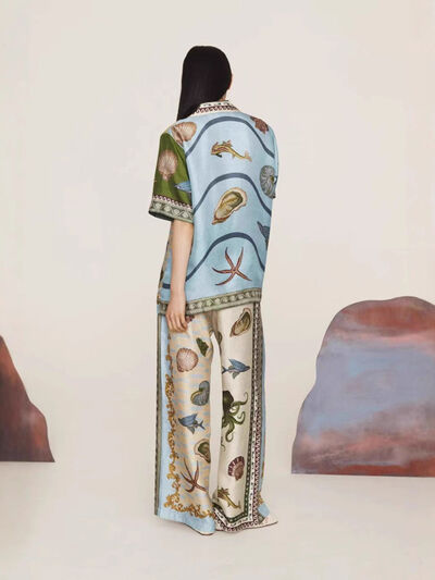Ocean Print Button-Down Shirt and Wide Leg Pants Set