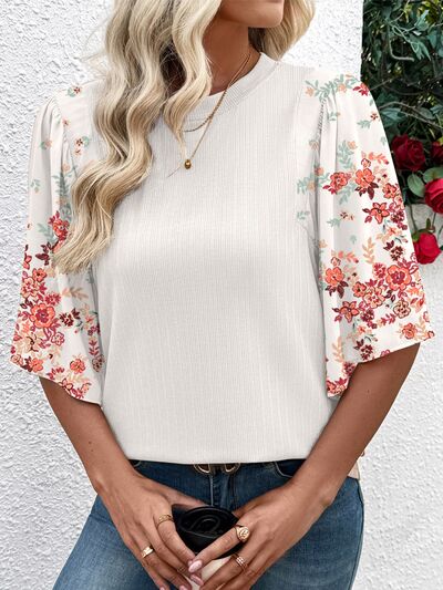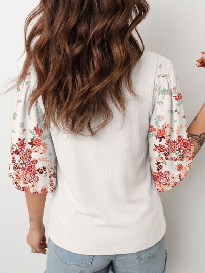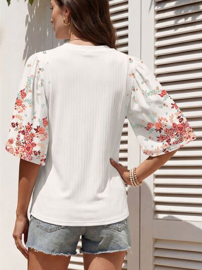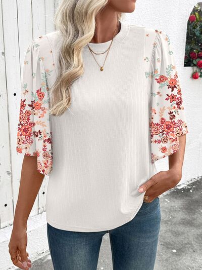 Ribbed Texture Floral Print Half Sleeve Patchwork Top