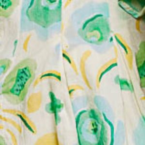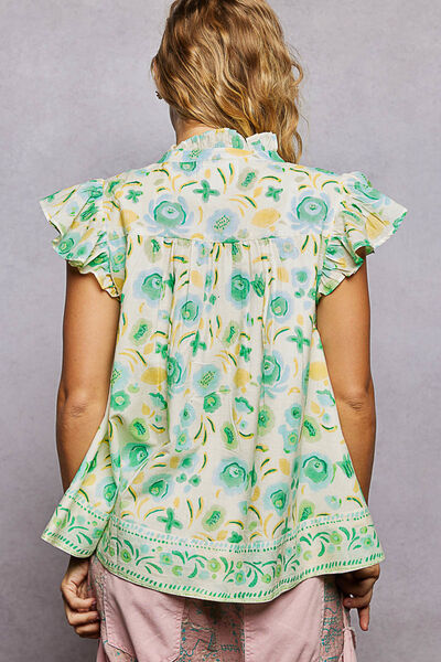 Lightweight printed woven top designed with a relaxed, airy silhouette and soft drape. Featuring a delicate stand collar with split neckline, adjustable tassel tie detail, and flutter sleeves with gentle ruffle accents. Finished with subtle border detailing at the hem and an allover floral motif, this top offers an easy, feminine look with refined texture and movement.