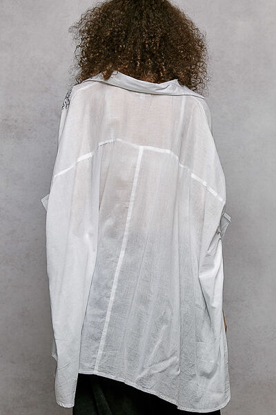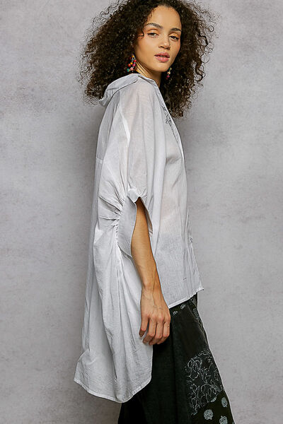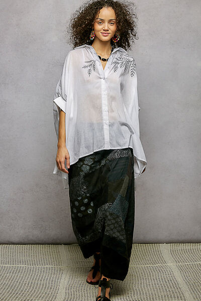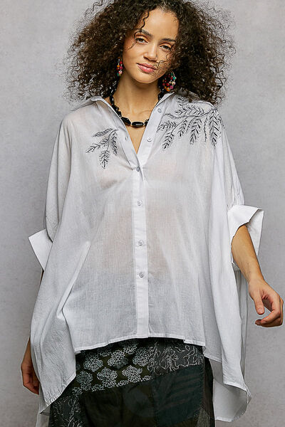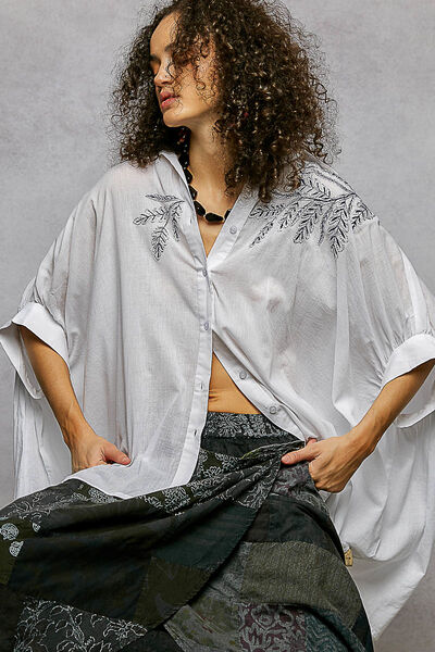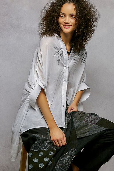 This short sleeve, relaxed fit shirt top, crafted from solid color cotton with a normal wash, is defined by intricate leaf inspired embroidery that sweeps across the shoulder and chest. The design features a classic button-down front and a voluminous, draped sleeve silhouette that enhances its airy, oversized profile. With a curved high-low hem and a crisp yet soft fabric texture, this piece focuses on the contrast between its clean tailored collar and the organic, artisanal detail of the tonal needlework.