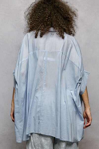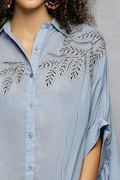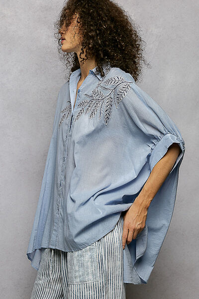 This short sleeve, relaxed fit shirt top, crafted from solid color cotton with a normal wash, is defined by intricate leaf inspired embroidery that sweeps across the shoulder and chest. The design features a classic button-down front and a voluminous, draped sleeve silhouette that enhances its airy, oversized profile. With a curved high-low hem and a crisp yet soft fabric texture, this piece focuses on the contrast between its clean tailored collar and the organic, artisanal detail of the tonal needlework.