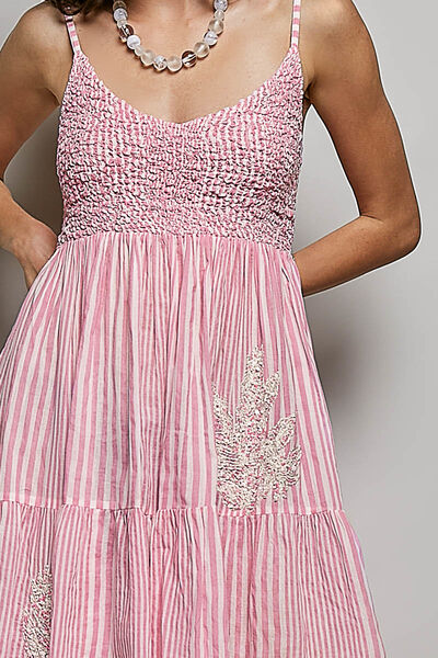 This V-neck sleeveless flowy dress is made of soft cotton for breathable, all-day comfort. It showcases a flattering flowy fit with delicate smocking detailing on the upper body. Adorned with bold spangle motif embroidery and a classic striped pattern, it blends eye-catching design with timeless style. The V-neck and sleeveless cut enhance its light, feminine silhouette, perfect for warm-weather occasions and effortless casual styling.