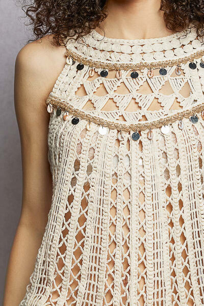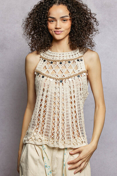 POL Halter Neck Sleeveless Crochet Top with Seashell & Mirror Dangle Trim