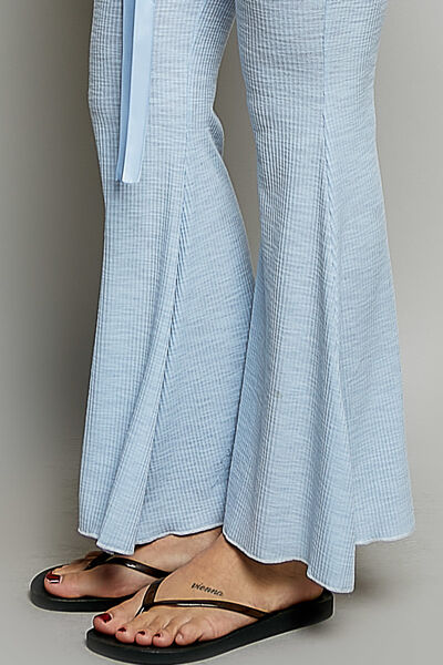 These light blue knit flare pants offer a blend of comfort and style. Crafted from a soft, breathable knit fabric, they provide a relaxed fit perfect for everyday wear. The flared leg design adds a touch of retro flair, while the drawstring waist ensures a customizable and comfortable fit. Ideal for casual outings or lounging at home, these pants are a versatile addition to any wardrobe. The lightweight material makes them perfect for warmer weather, offering both style and comfort.