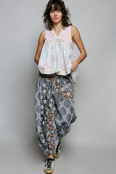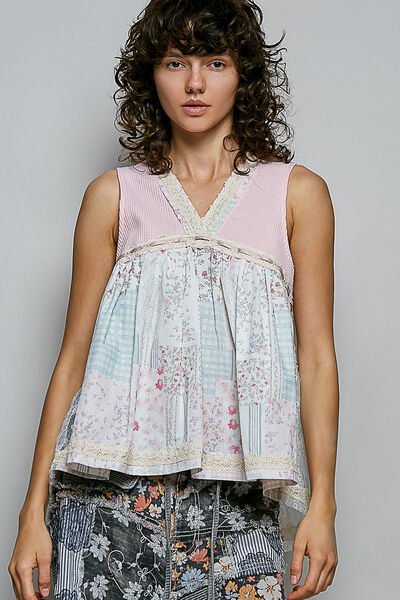 POL Floral V-Neck Sheer Tank with Lace Trim