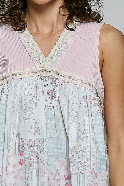 This Floral V-Neck Sheer Tank features a delicate floral print and a flattering V-neckline for a soft, feminine look. It is made with lightweight sheer fabric that offers an airy, breathable feel. Beautiful lace trim adds elegant detail along the edges, enhancing its romantic style. The sleeveless tank design is perfect for layering or wearing alone in warm weather. Versatile and chic, it easily elevates any casual or dressy outfit.