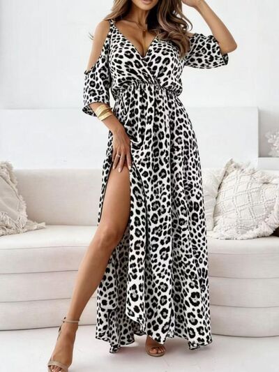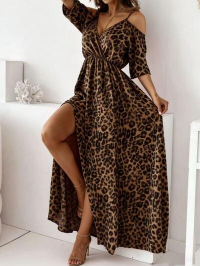 Leopard Print Cold Shoulder Slit Maxi Dress