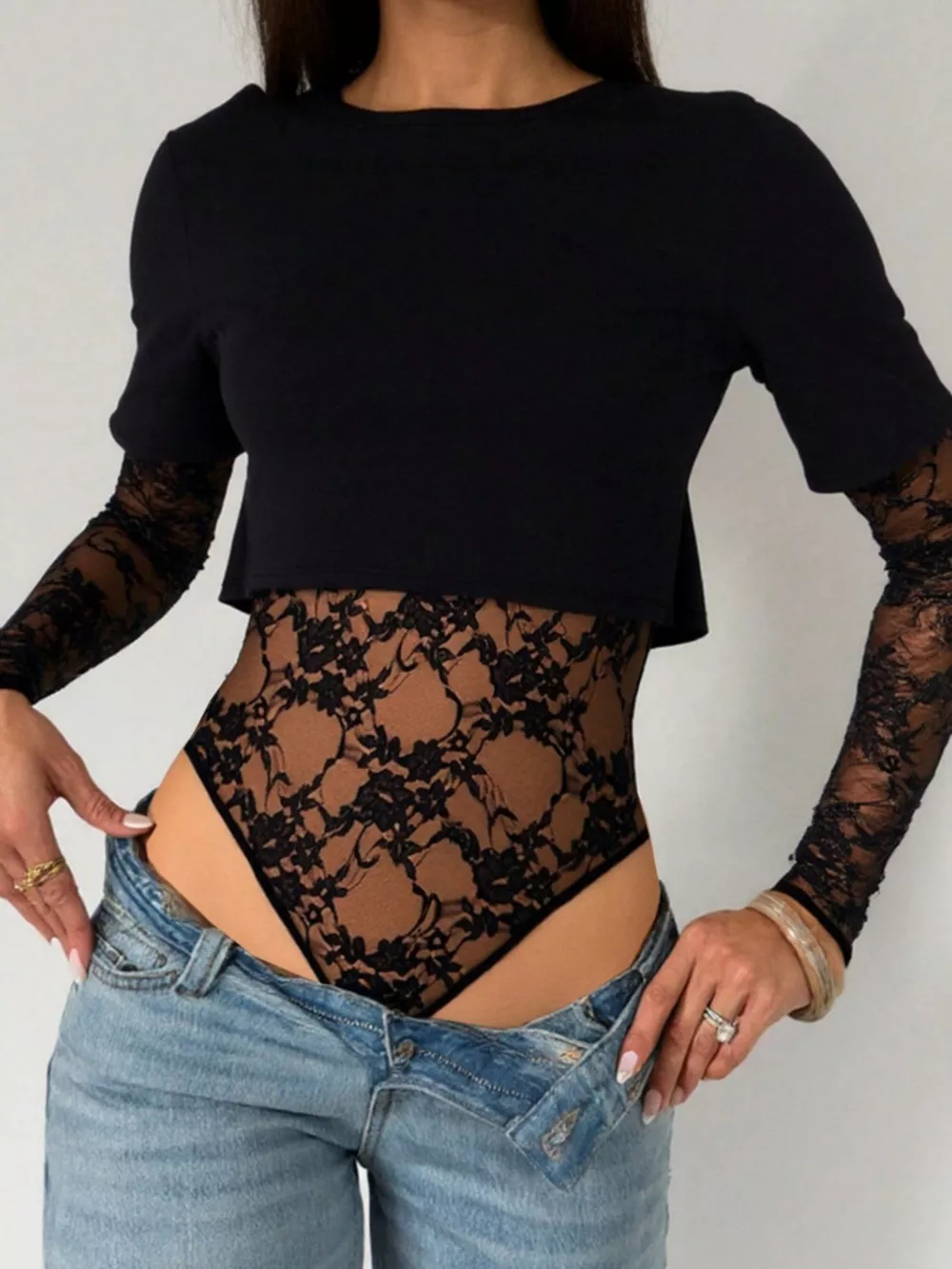 Full Size Lace Patchwork Round Neck Bodysuit Plus Size