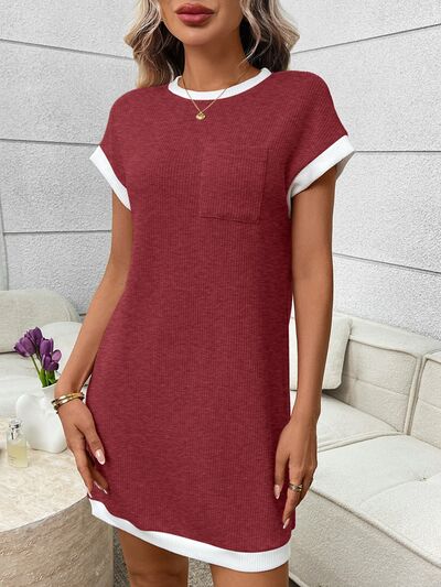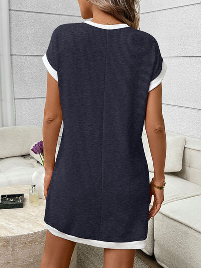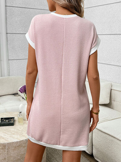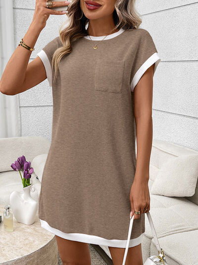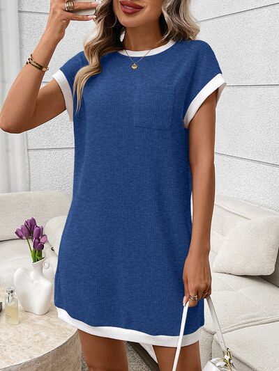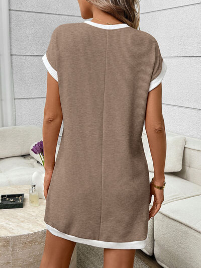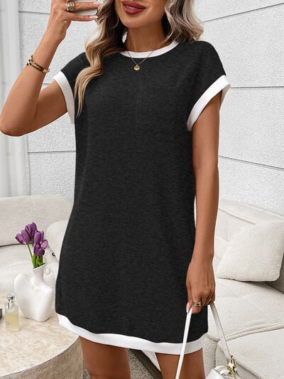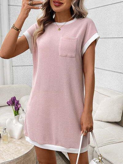 Contrast Trim Ribbed Knit Mini Dress with Pocket