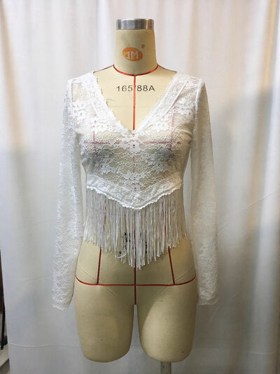 Full Size Fringe Hem Lace Long Sleeve Top Plus Size