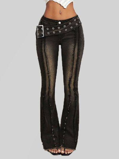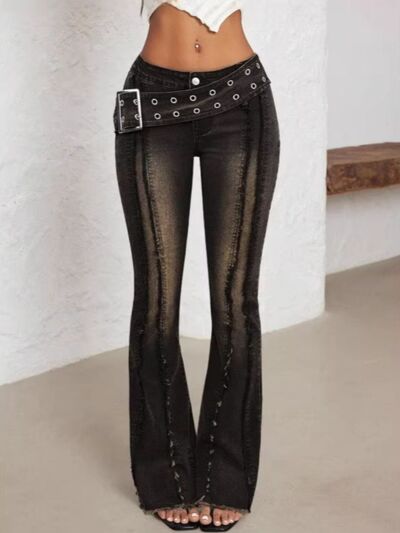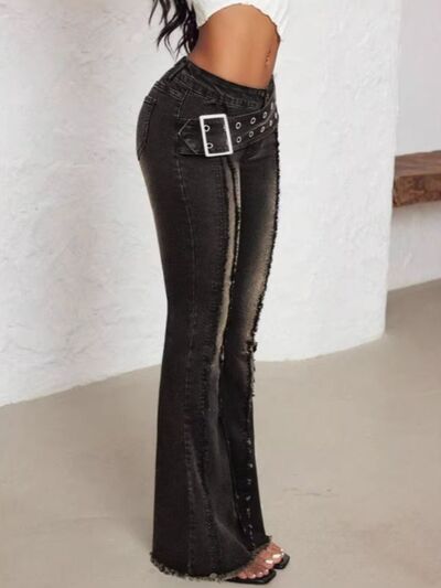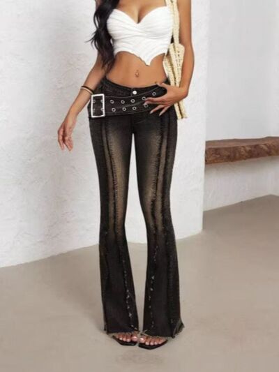 These fashion Belted High Waist Flare Jeans are a must-have for any fashion-forward wardrobe. Crafted from durable denim, these jeans feature a flattering high waist and a stylish flared leg cut. The unique belted design adds a touch of edginess, while the distressed detailing provides a vintage-inspired look. Perfect for creating a variety of stylish outfits, these jeans are versatile enough to be dressed up or down. The comfortable fit ensures all-day wearability, making them ideal for both casual and dressier occasions. The figure-flattering silhouette enhances your curves, while the eye-catching design is sure to turn heads. These jeans are a perfect blend of style, comfort, and durability, making them a valuable addition to your denim collection.